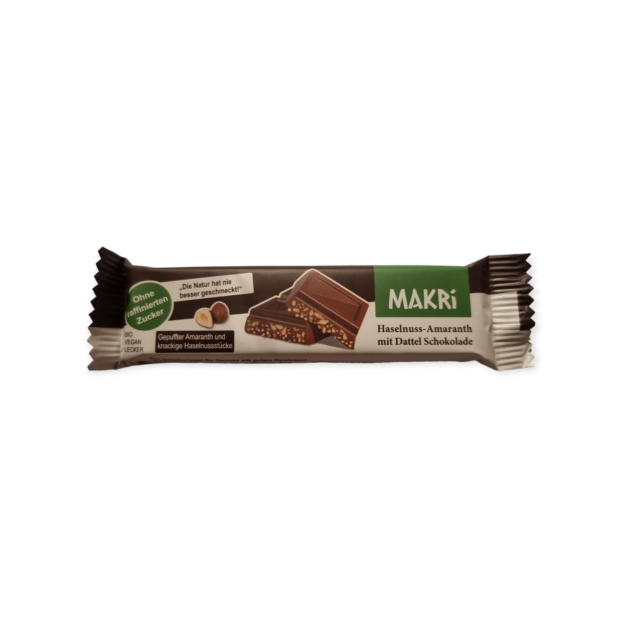 Wer die Makri-Schokoladen liebt, kann sich freuen, denn es gibt jetzt endlich auch einen Makri Schokoriegel! Dieser besteht aus gepufftem Amaranth und knackigen Haselnusstückchen, umhüllt von dunkler Dattelschokolade. Wie alle Makri Produkte kommt auch der Makri Bio Schokoriegel Haselnuss Amaranth ganz ohne raffinierten Zucker aus, alles Weitere erledigt die Dattel. Bio, vegan, laktosefrei und glutenfrei.