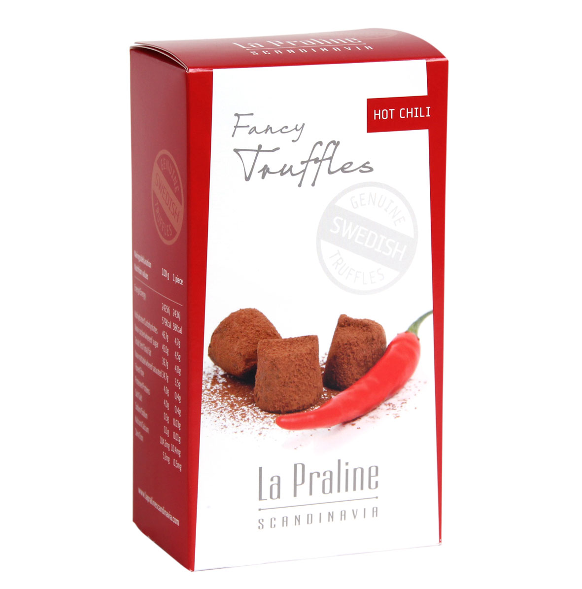 La Praline Fancy Truffles Chili kommt aus Schweden und ist ein feines, kakaohaltiges Schokoladenkonfekt mit einer deutlichen Chilischärfe das von der samtigen Schokolade angenehm umspielt wird. Die cremig-zartschmelzende Konsistenz lässt die Spezialität im Mund zergehen. Auch optisch sind die La Praline Fancy Truffles mit Chili ein Genuss: Die unregelmäßigen, wie zufällig entstandenen Formen der Fancy Truffles wirken sehr reizvoll und die abschließende Kakaopuderschicht sorgt für ihre edle Vollendung.