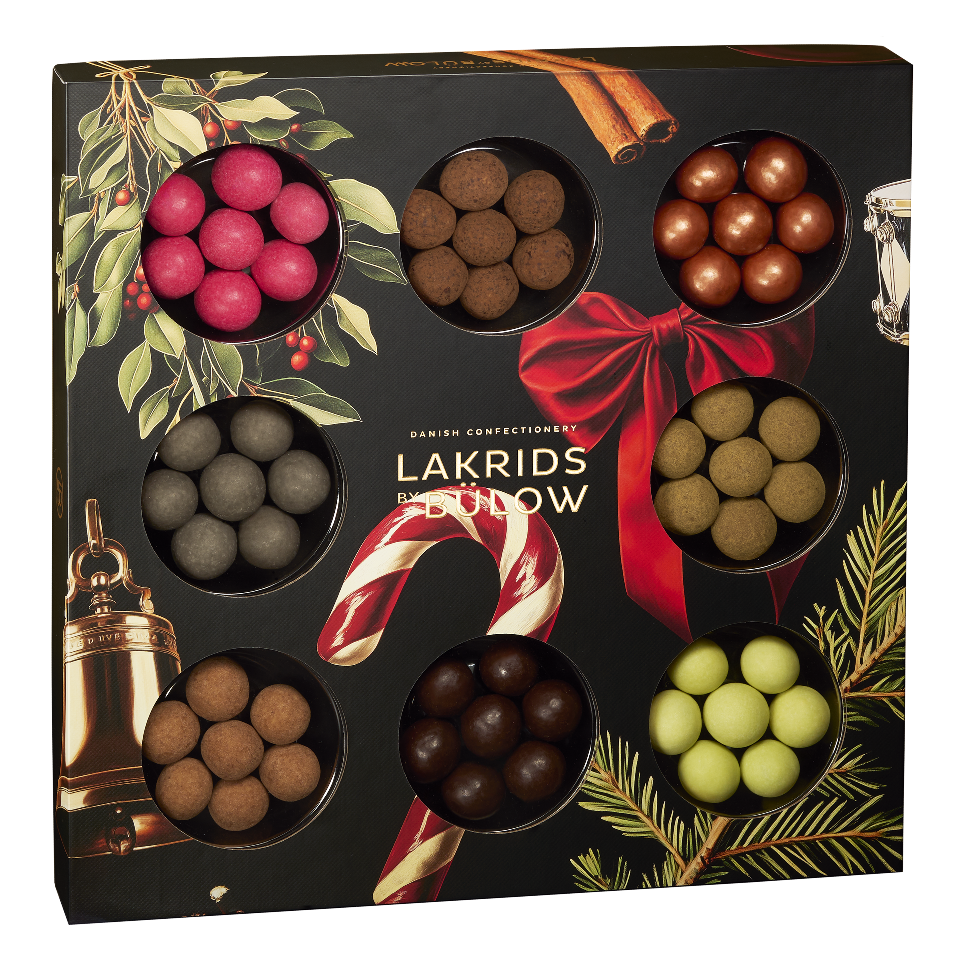 61% weisse, Dulce, Milch-, und Zartbitterschokolade (EU)(Zucker, Kakaobutter, Milchpulver, Kakaomasse, Molkenpulver (Milch), Emulgatoren (Sojalecithin, Lecithin), natürliche Aromen, Milchfett), Zucker, Reismehl, Invertzuckersirup, Melasse, Glukosesirup, 2% Süssholzextrakt (nicht-EU), Fruchtpulver (Erdbeere, Himbeere (gefriergetrocknet)), Rapsöl, Salz, Kakaonibs, Überzugsmitteln (Karnaubawachs, Schellack, Gummiarabikum), Meersalz, alkalisierter Kakao, Dextrose, Ammoniumchlorid, natürliche Aromen, Farbstoffe (Eisenoxid, Karmin, Beta-Carotin, Calciumcarbonat, Curcumin), Spirulina Konzentrat, Stabilisator: Gummiarabikum, Kakaobutter, Moosbeere (getrocknet), schwarze Johannisbeere Konzentrat, Zitrone Konzentrat, Säuerungsmittel: Apfelsäure, Aromen.