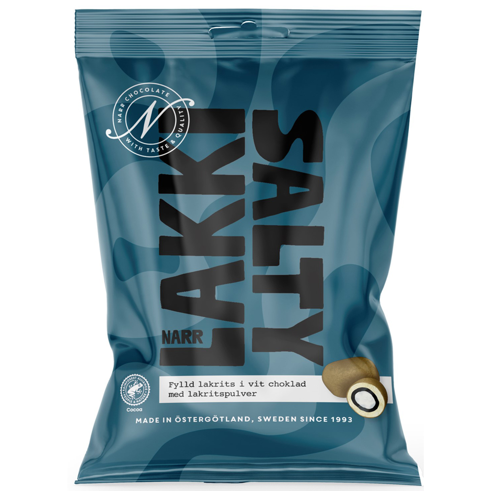 Narr Lakki Salty aus Schweden haben einem gefüllten Salzlakritzkern, und sind umhüllt mit Michschokolade und mit Lakritzpulver überzogen.