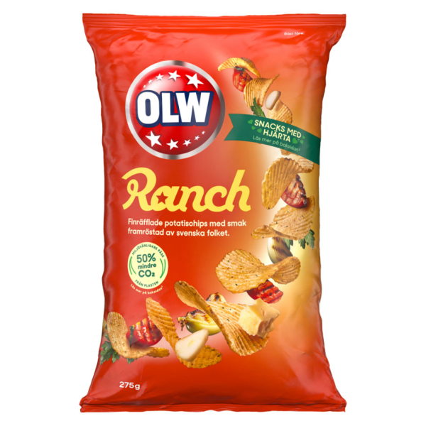 OLW Chips Ranch sind herrlich knusprige Chips aus Schweden. Um die besten Chips herzustellen werden nur die besten Kartoffeln verwendet. Die dünnen geriffelten Ranchchips schmecken nach Grillgemüse, Kräutern und Käse. Köstlich!
