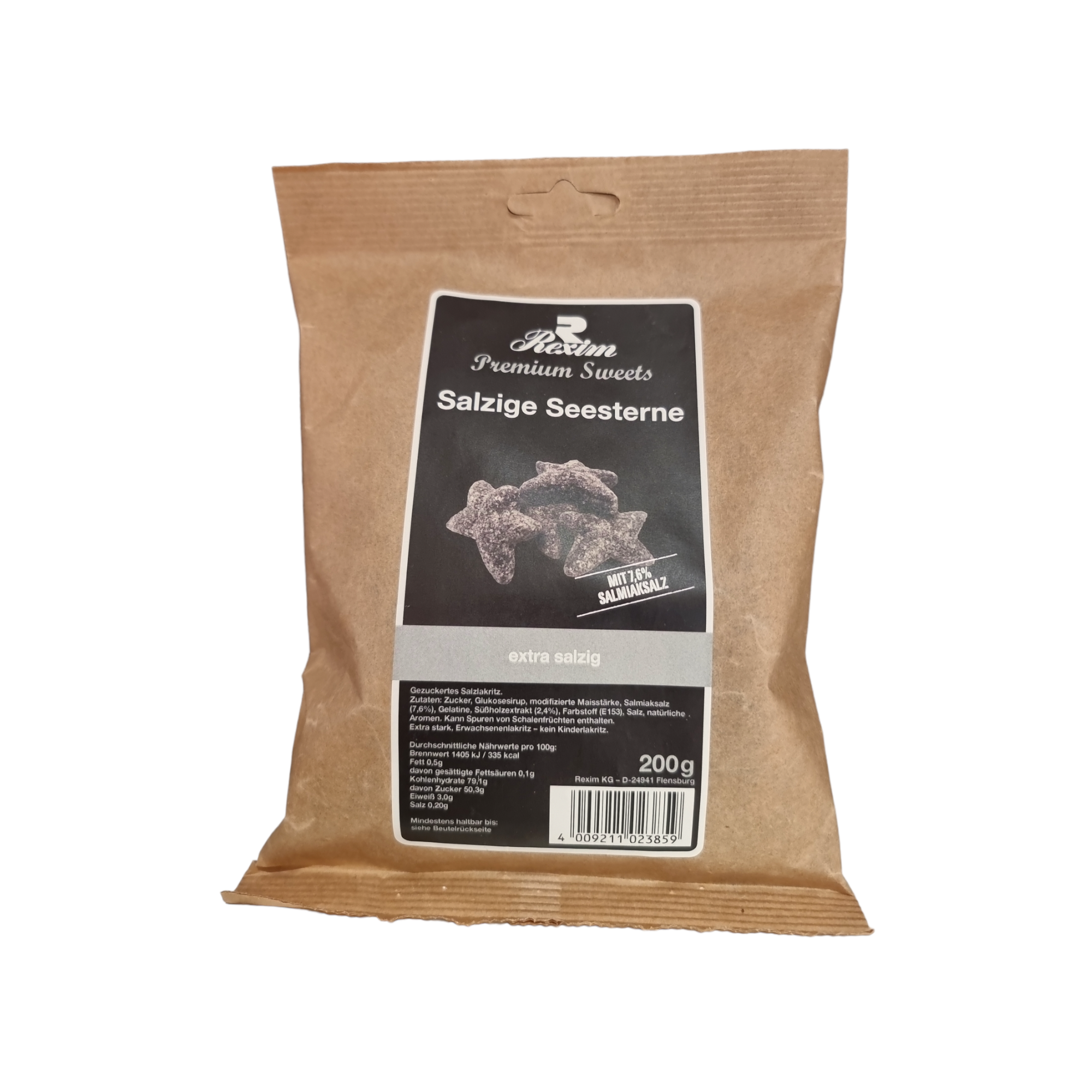 Schwarzes super-salziges Lakritz in Form von Seesternen, wunderbar würzig im Geschmack.