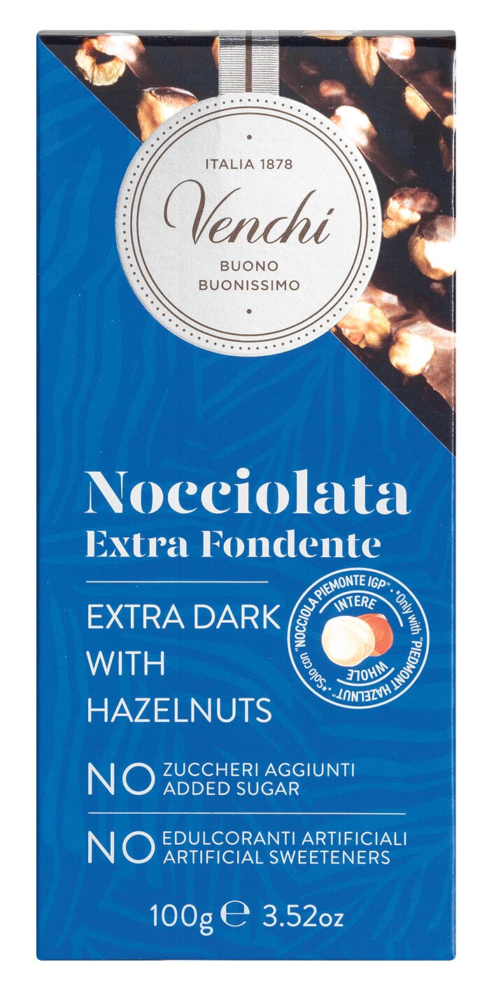 Die Venchi Dunkle Schokolade mit Haselnüssen ohne Zuckerzusatz begeistert mit kraftvollem Kakaoaroma aus 75% Kakao und ganzen Piemonteser Haselnüssen IGP. Mit ihrem hohen Kakaoanteil ist diese italienische Schokolade ideal für Liebhaber intensiver Geschmacksrichtungen.