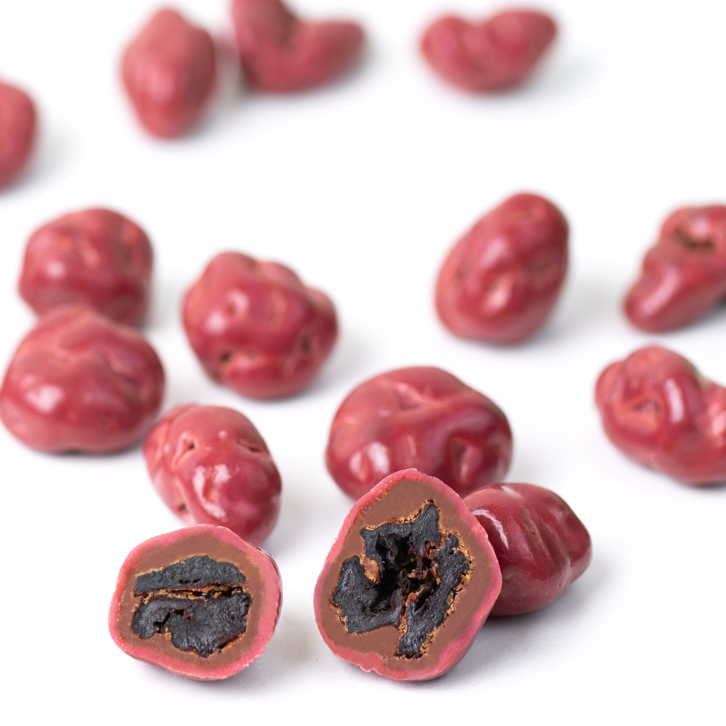Sauerkirschen getrocknet°*(33%), Rohrohrzucker°*, Kakaobutter°*, Kakaomasse°*, VOLLMILCHPULVER°, MAGERMILCHPULVER°, Sauerkirschen gefriergetrocknet°(4%), Überzugsmittel°(Glukosesirup°, Stabilisator: Gummi arabicum°, Sonnenblumenöl°), Emulgator: Lecithin (SOJA)°, Zitronenpulver°(Zitronensaftkonzentrat°, Maisstärke°, Zucker°), Emulgator: Lecithin (Sonnenblume)°, Vanilleschotenpulver°*, Steinsalz