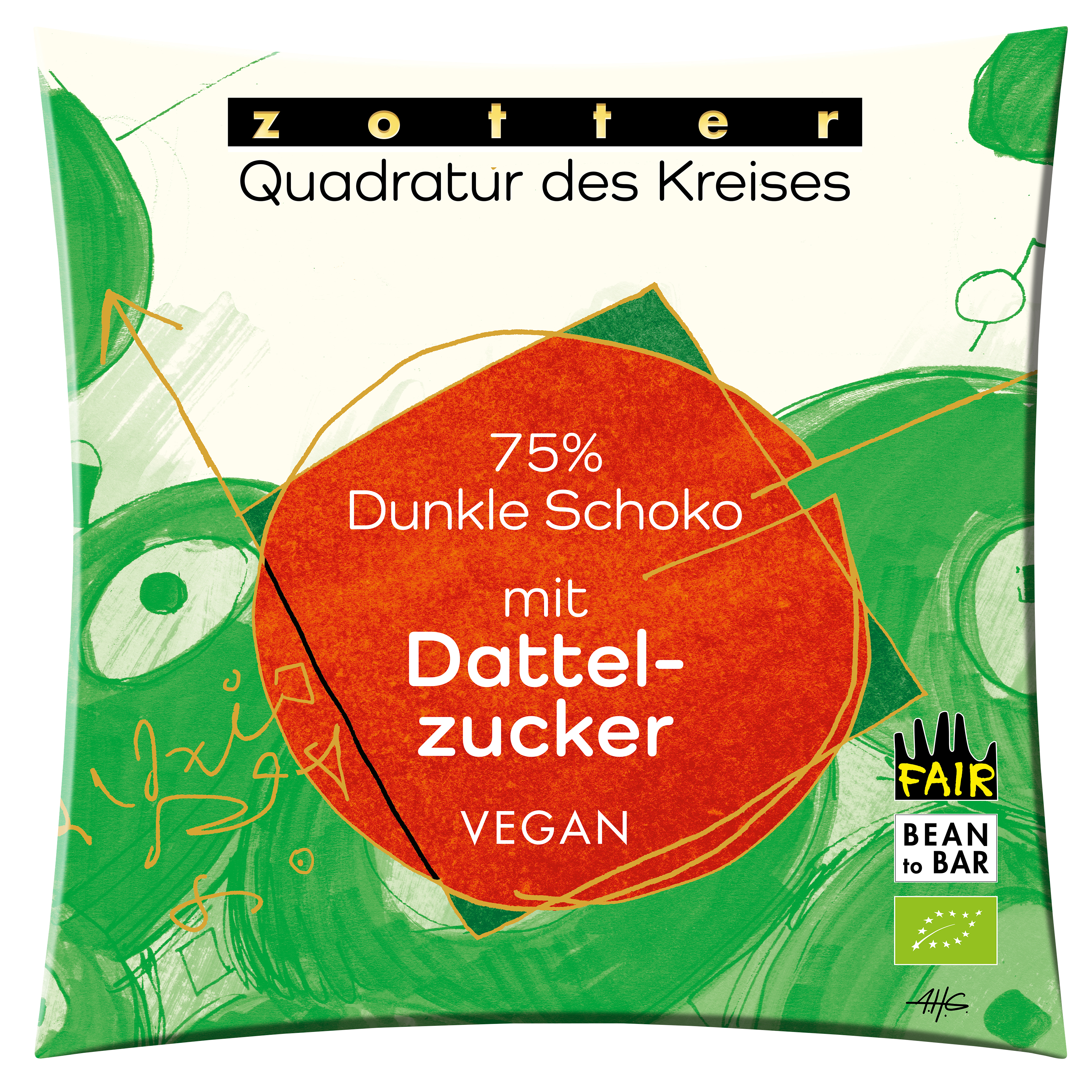Dunkle Schoko, nur mit Datteln gesüßt: eine dunkle Schokolade mit klassischen 75 % Kakaoanteil, gesüßt mit trendigem Dattelzucker, dem neuen Shootingstar unter den Zuckeralternativen. Dattelzucker entsteht aus gemahlenen Datteln, sprich Datteln in Pulverform, die von Natur aus eine hohe Süßkraft besitzen und einen eleganten Karamellgeschmack entwickeln. Komplett vegan mit natürlicher Süße.