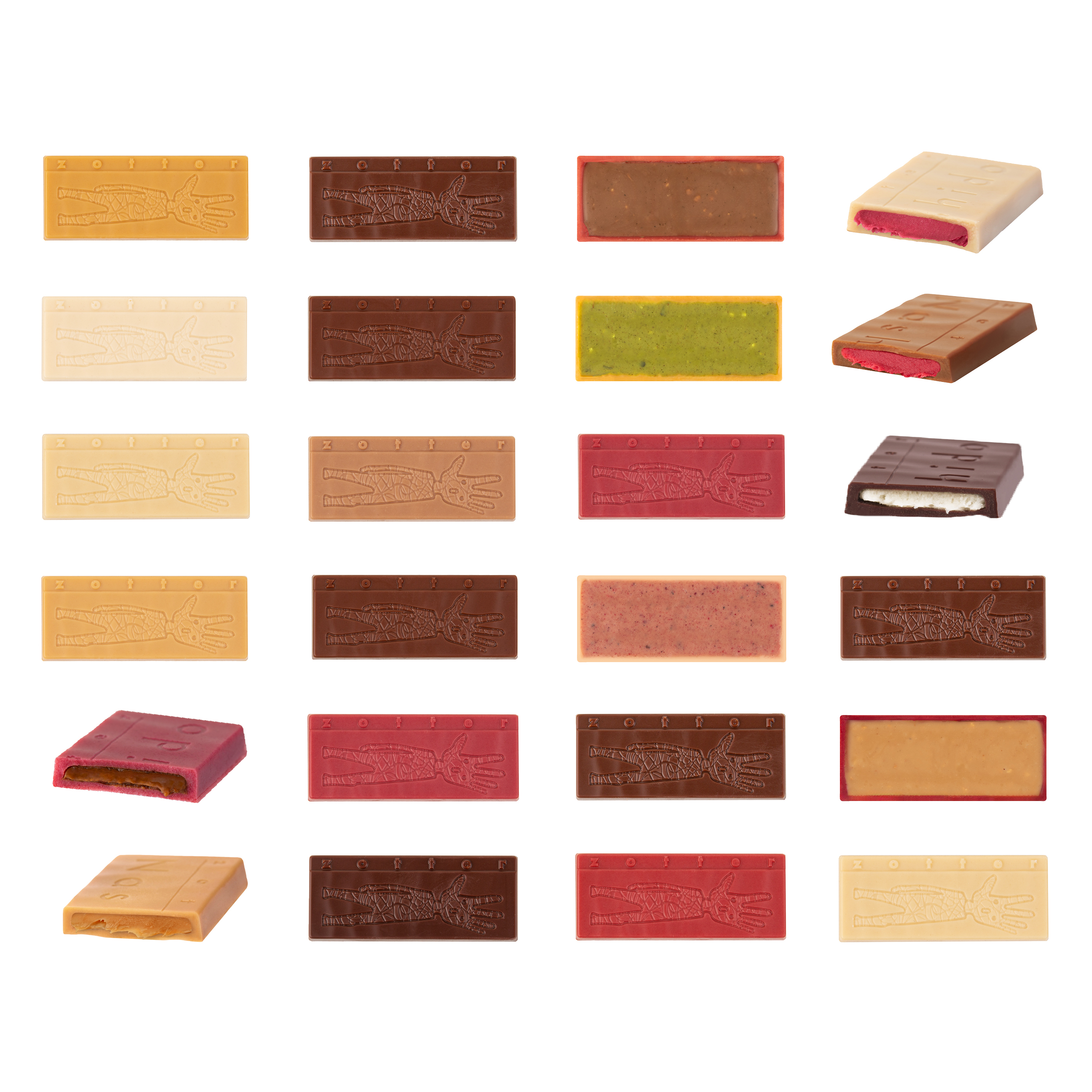 Rohrohrzucker°*, Kakaobutter°*, Kakaomasse°*, VOLLMILCHPULVER°, MAGERMILCHPULVER°, MANDELN°, Reisdrinkpulver°(Reis°, Sonnenblumenöl°, Salz), MILCHKARAMELLPULVER°(MAGERMILCHPULVER°, Zucker°), HASELNÜSSE°*, Himbeeren gefriergetrocknet°, CASHEWKERNE°*, Kürbiskerne°, Vollrohrzucker°*, HAFERDRINKPULVER° (HAFER° fermentiert), Erdbeeren gefriergetrocknet°, Kokosraspeln°*, SÜSSMOLKENPULVER°, Kokospulver°(Kokosnusspaste°, Kokosnussmilch°, Kokosnussmehl°), Invertzuckersirup°, Reisdrink°(Wasser, Reis°, Sonnenblumenöl°, Meersalz), VOLLMILCH°, Himbeerkonzentrat°, BUTTER°, Johannisbeerkonzentrat°, Preiselbeeren gefriergetrocknet°, Maracuja gefriergetrocknet° (Maltodextrin°, Maracujasaftkonzentrat°), Marillen gefriergetrocknet°, Emulgator: Lecithin (SOJA)°, CASHEWDRINKPULVER°(CASHEWDRINK°, Maltodextrin°[Tapioka]), Süßungsmittel: Erythrit°, Stärkesirup°, Johannisbeeren gefriergetrocknet°, Vanilleschotenpulver°*, Emulgator: Lecithin (Sonnenblume)°, Zitronenpulver°(Zitronensaftkonzentrat°, Maisstärke°, Zucker°), Mango getrocknet°, Steinsalz, Zitronensaftkonzentrat°, Heidelbeeren gefriergetrocknet°, Zimt°*, Sternanis°, Pfefferminzöl°, Rosenblüten°, Lavendelöl°